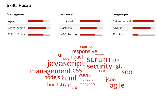Siamo giunti all'ultima parte del CV, vogliamo fissare nella mente del recruiter le nostre competene e due strumenti, per lo più grafici, ci vengono in aiuto: le progress bar e le words cloud.